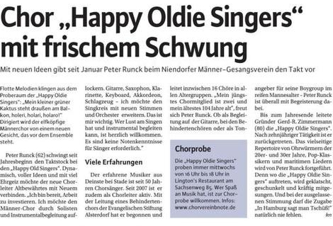 Peter Runck übernahm im Januar 2016 die Leitung der Happy Oldie Singers. Die regelmäßigen Chorproben finden jeweils mittwochs in der Zeit von 16 – 18:00 Uhr im Lington´s Restaurant in Niendorf, Sachsenweg 85, statt